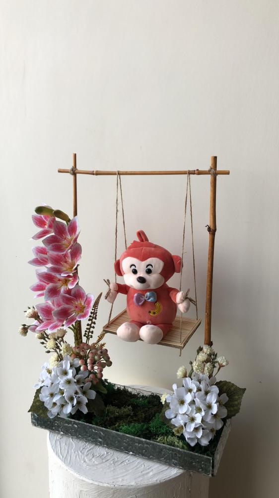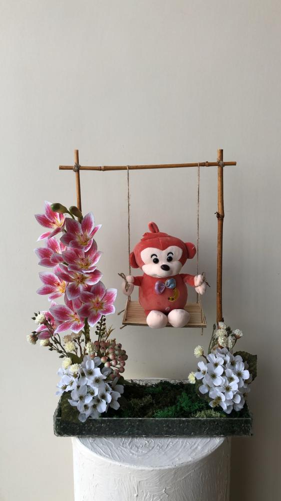بوكس اكريليك يحتوي على ورد صناعي فاخر وأنيق واغصان الورد الهولندي المشابه للطبيعي مع دُميه للأطفال